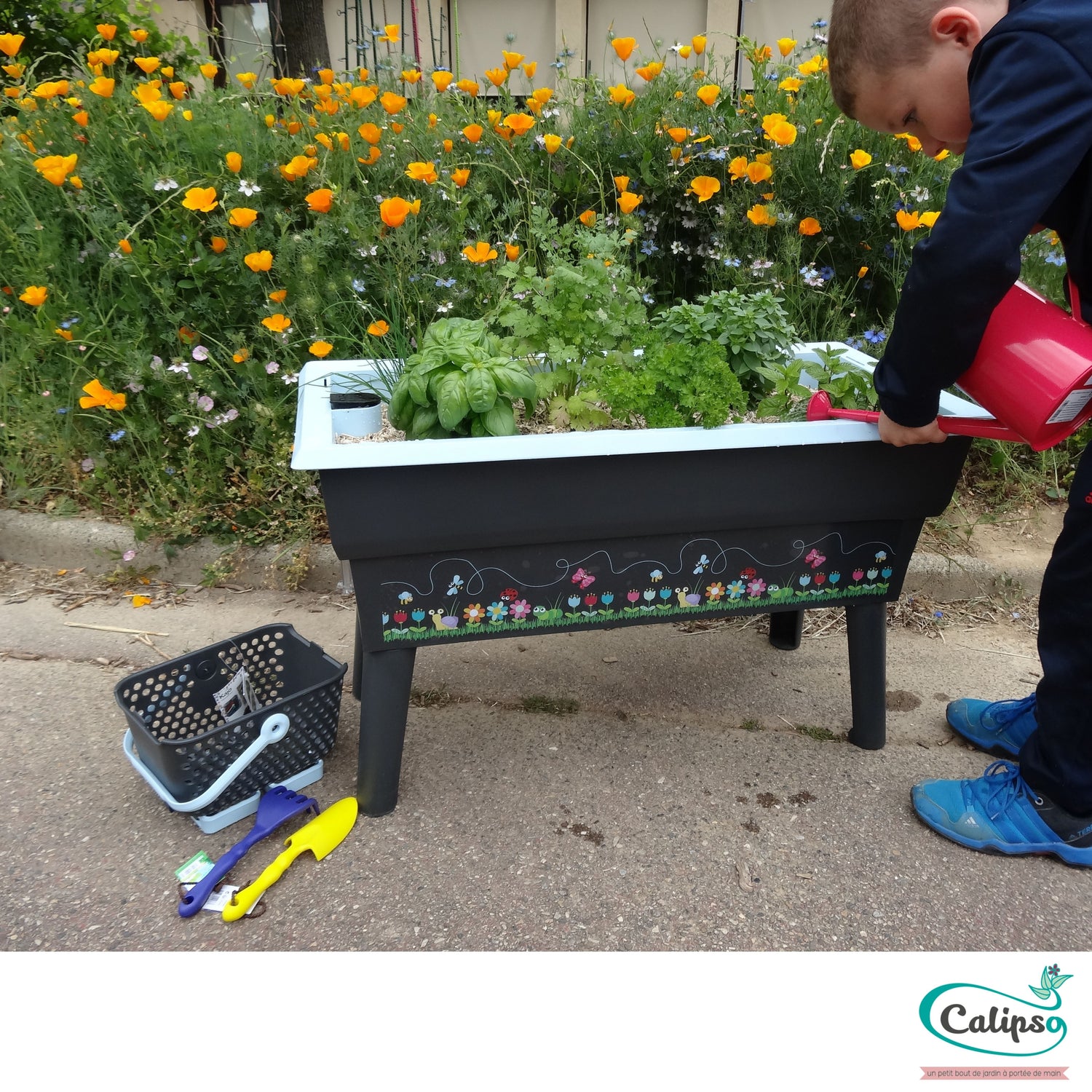 Cette jardinière basse est adaptée à la taille des enfants, elle est colorée et personnalisable grâce à une double frise autocollante décorative offerte (à coller sur la partie basse du bac).