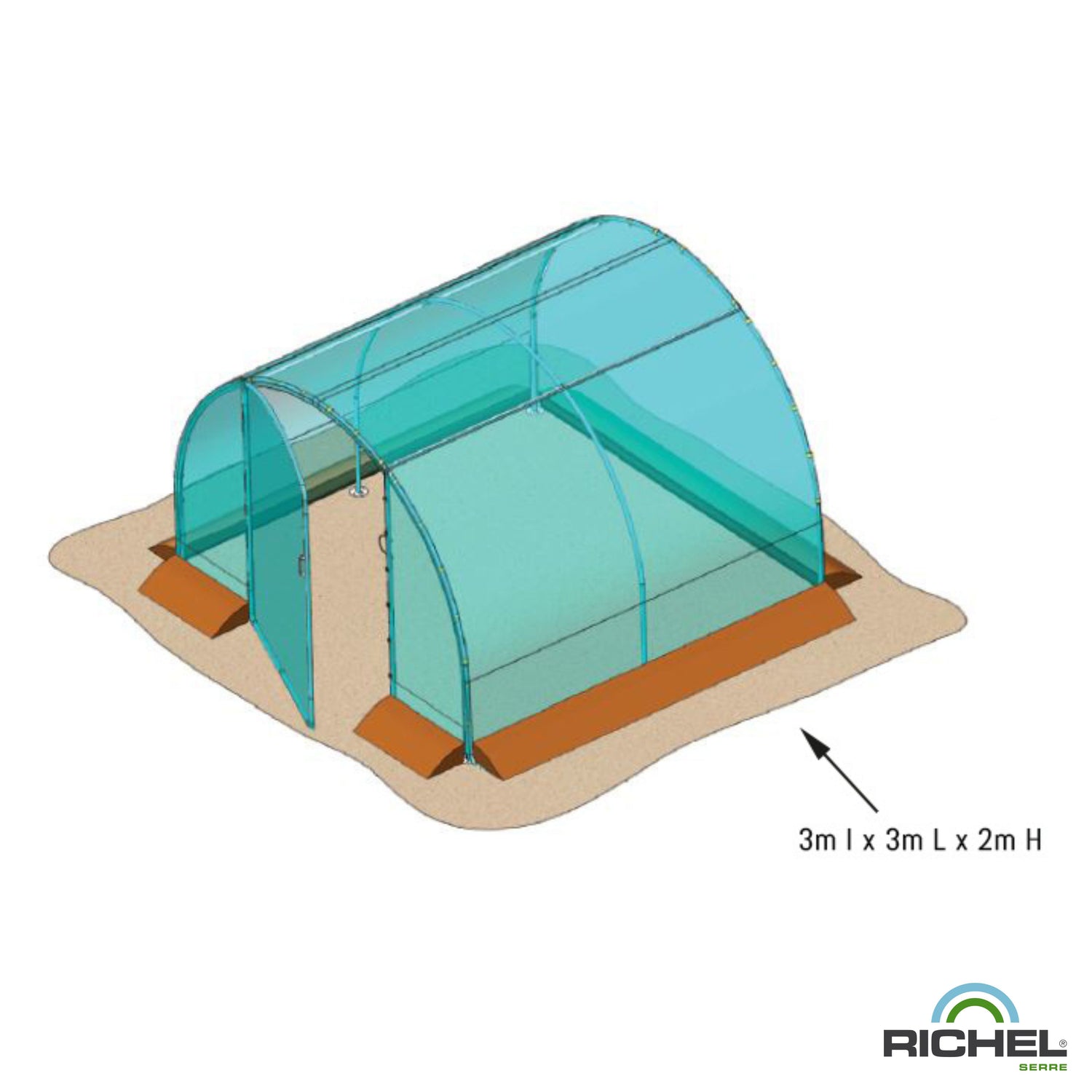- P881817 : Gaine de couverture doublée, pour serre Richel de largeur 3 m, en polyéthylène (2x180 microns) traitée anti UV 4 ans. Dimensions de la bâche : 7 m x 3,12 m. Fixations par tension de câbles aux extrémités (non fournis).