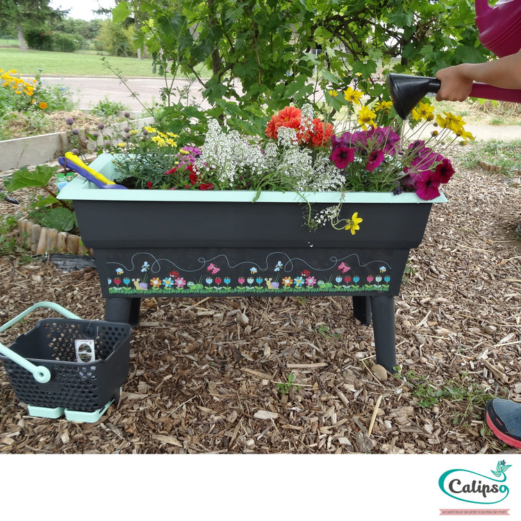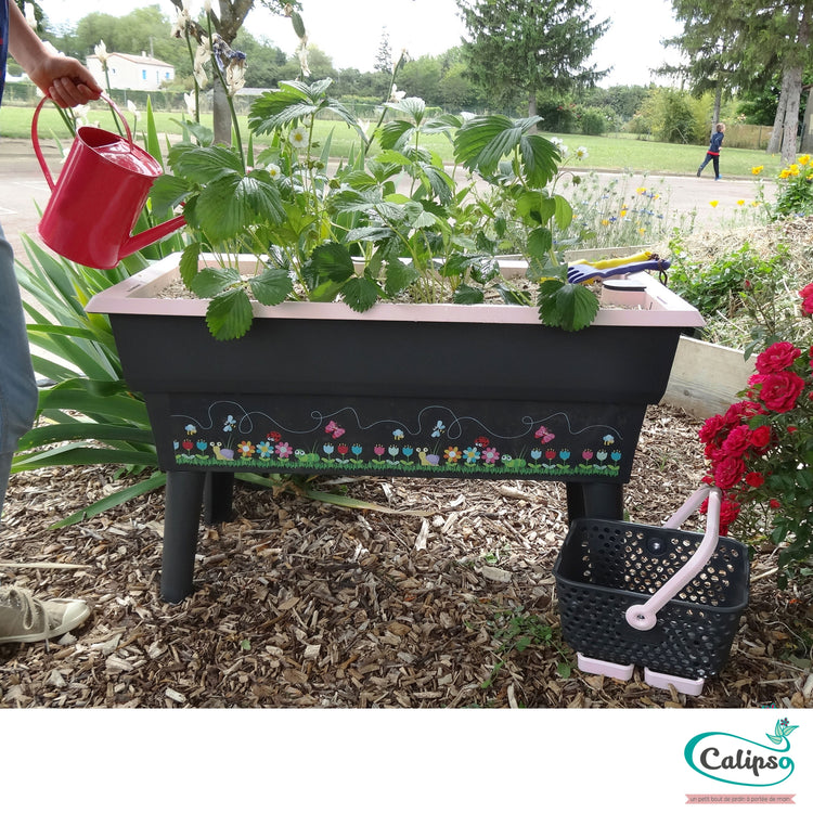Cette jardinière basse est adaptée à la taille des enfants, elle est colorée et personnalisable grâce à une double frise autocollante décorative offerte (à coller sur la partie basse du bac).